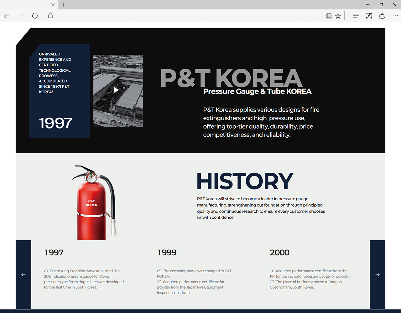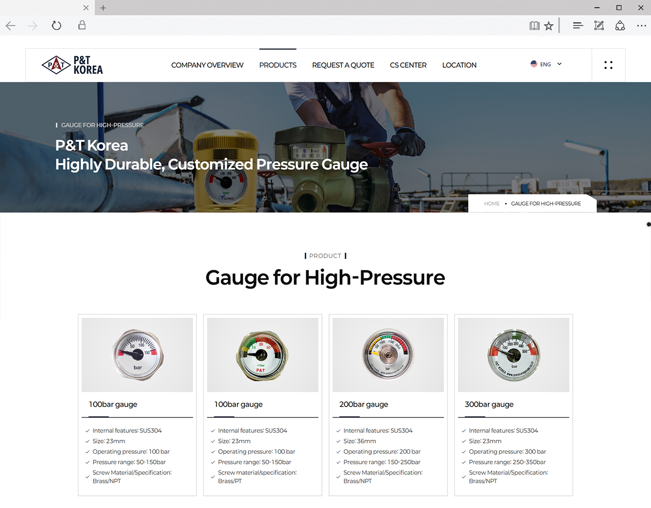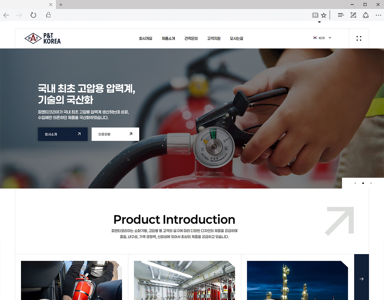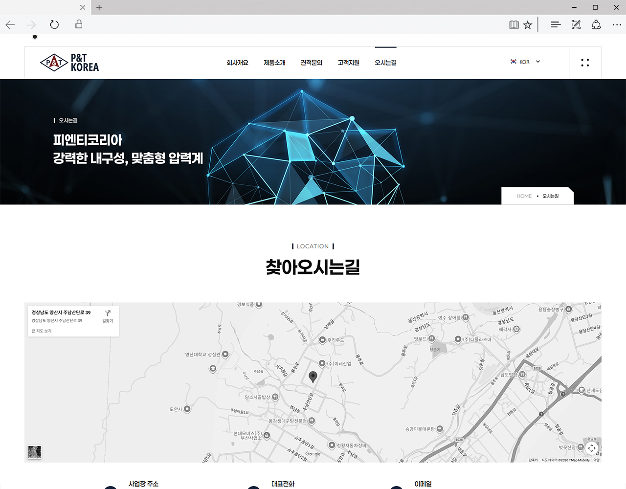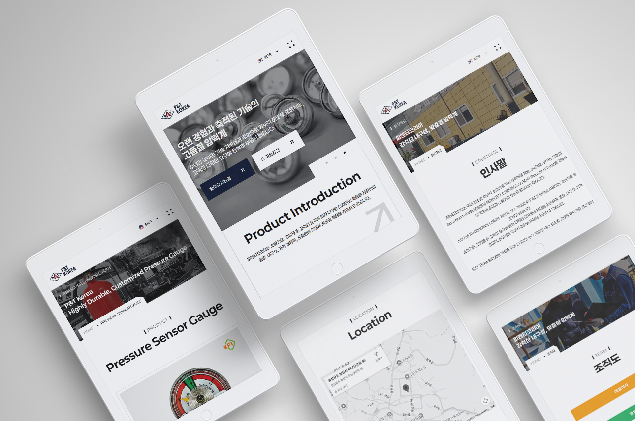 양산 웅상 주남공단에 위치한 소화기용, 가스계용, 고압용, 접점, 압력 센서 게이지 등 압력계를 개발 생산 제조하는 ‘피엔티코리아(P&T KOREA)’ 기업 홈페이지를 제작하였습니다.